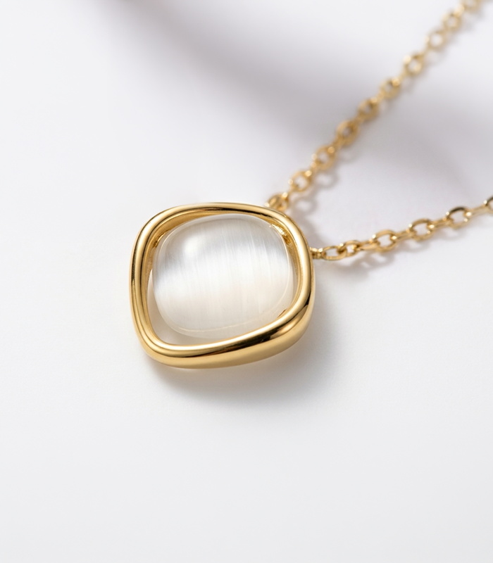 This cat eye stone pendant necklace features a softly rounded square frame finished in radiant 18K gold plating. At its center sits a smooth white cat eye stone, known for its distinctive glowing reflection that shifts gently with light.