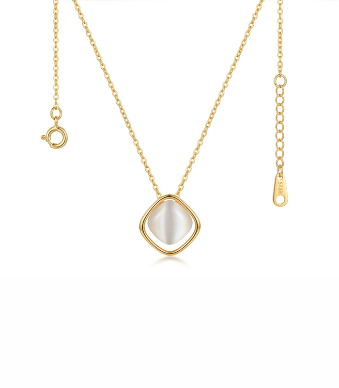 The rounded square design introduces a modern structure while maintaining a gentle, organic feel. The luminous stone reflects light in a smooth, flowing band, giving the pendant a subtle sense of movement and depth.