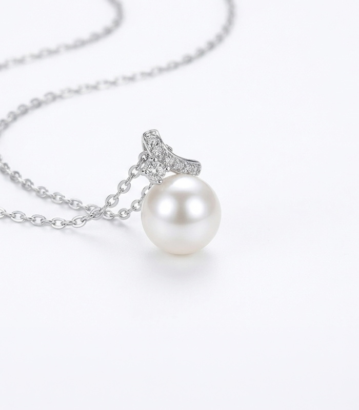 A timeless expression of elegance. This sterling silver pearl pendant necklace features a luminous round pearl suspended beneath a delicate crystal accent, creating a graceful balance of softness and sparkle. Designed to sit perfectly along the collarbone, it adds effortless refinement to both everyday outfits and special occasions.