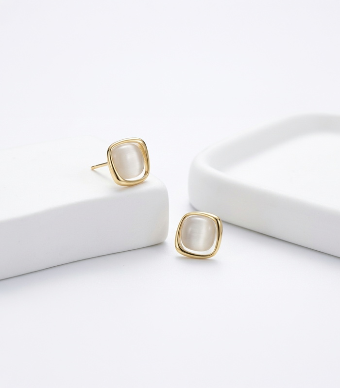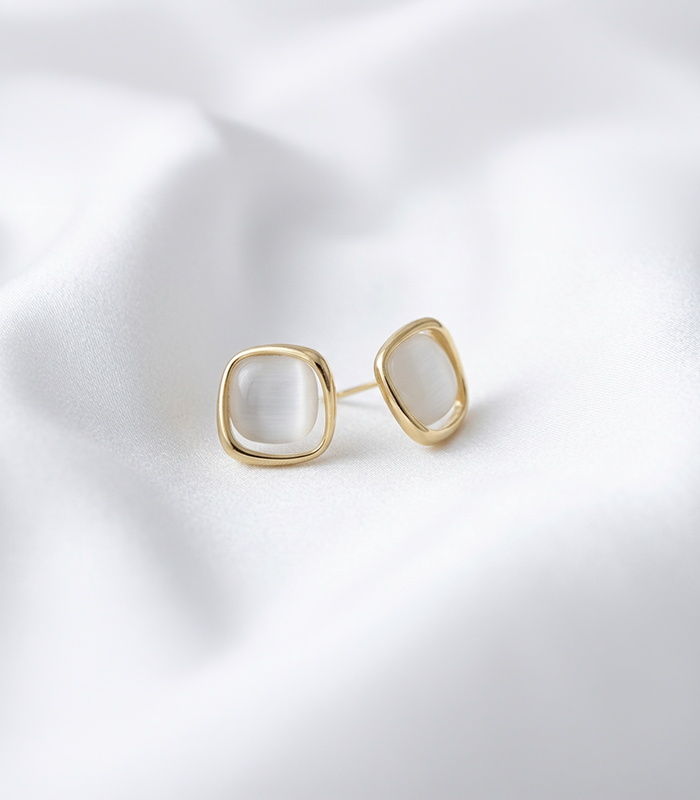 Designed with a soft square silhouette and a luminous cat eye stone center, these earrings bring a gentle glow to your everyday look. The warm gold tone pairs naturally with the milky white stone, creating a refined and modern balance.