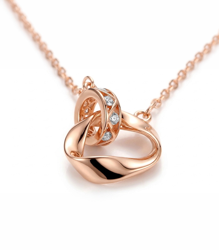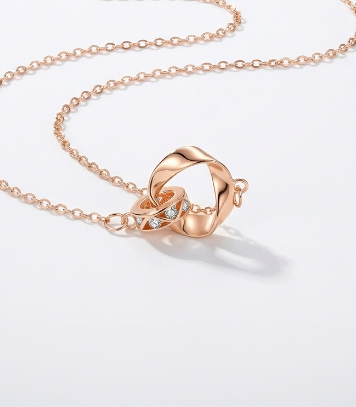 Elegant and contemporary, the Interlocking Rose Gold Pendant Necklace brings together fluid lines and delicate sparkle in one refined design. This pendant features two interwoven rings, one finished in smooth rose gold and the other accented with shimmering stones, creating a look that feels both modern and timeless.