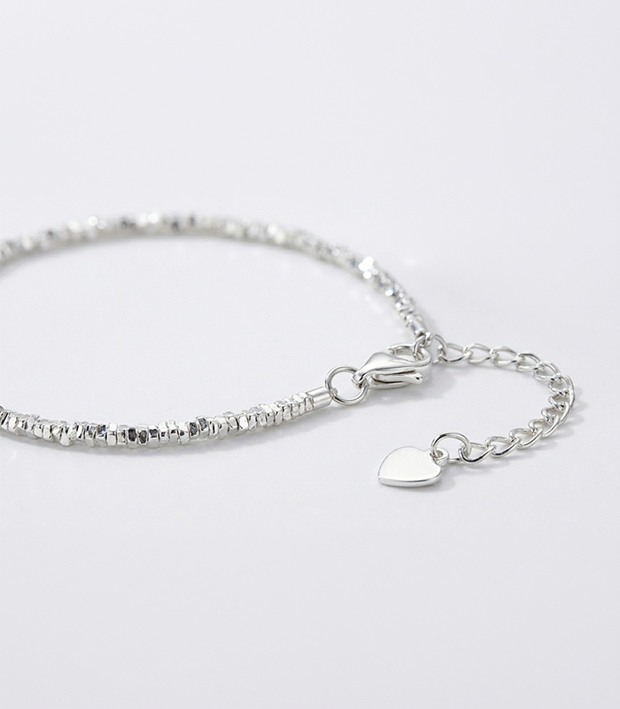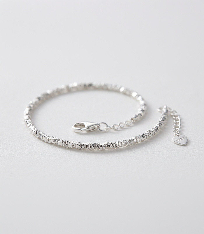 Rather than relying on bold shapes or oversized details, the design focuses on fine silver texture and subtle reflection. The small polished bead-like elements create a soft rhythmic effect around the wrist, giving the bracelet a refined look that feels light, balanced, and easy to style. Its simplicity makes it timeless, while the gentle shine adds just enough presence to keep it from feeling plain.