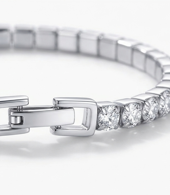 This sterling silver tennis bracelet features a fine row of round-cut stones, carefully aligned to create a smooth and continuous sparkle. Its slim design enhances the natural shape of the wrist, offering a clean and sophisticated finish.