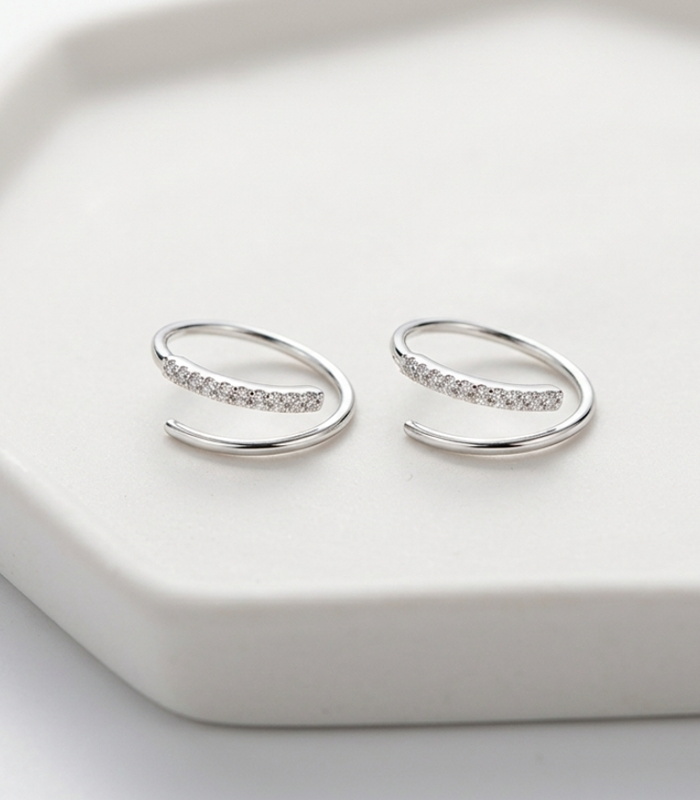 These silver spiral hoop earrings feature a slim open curve with a row of delicate pavé stones set along one side, creating a subtle contrast between shine and texture. The flowing shape feels softer than a standard hoop, giving the design a more contemporary look while still remaining timeless enough for everyday wear.